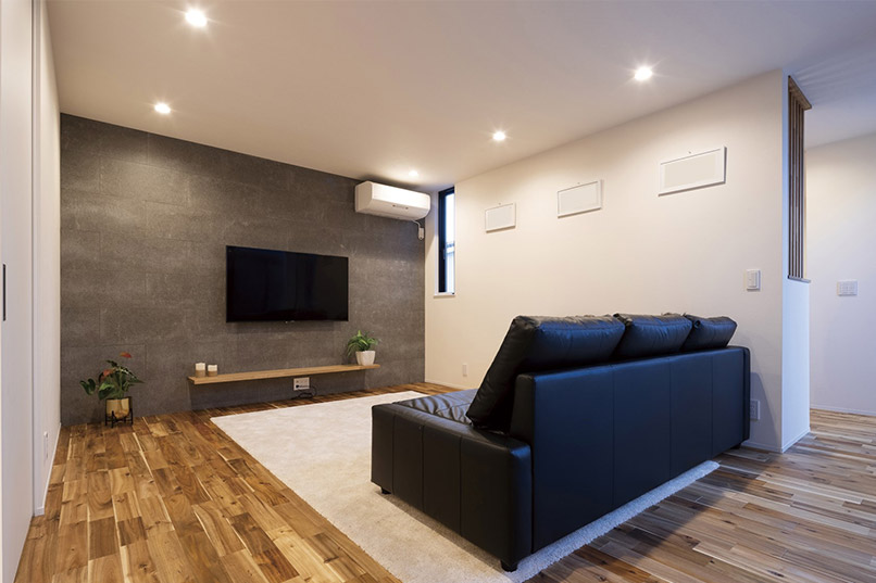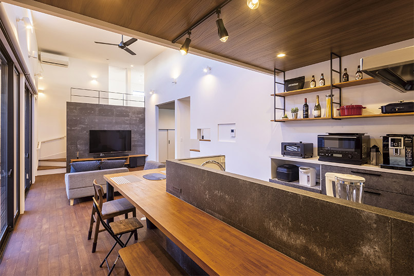 厚みのある石張風の外壁とガルバリウムを使い、素材感の違いでインパクトのある外観に。内装も床材に無垢のアカシア、アクセントにコンクリート風の壁を使い、落ち着いた飽きのこないインテリアも印象的です。