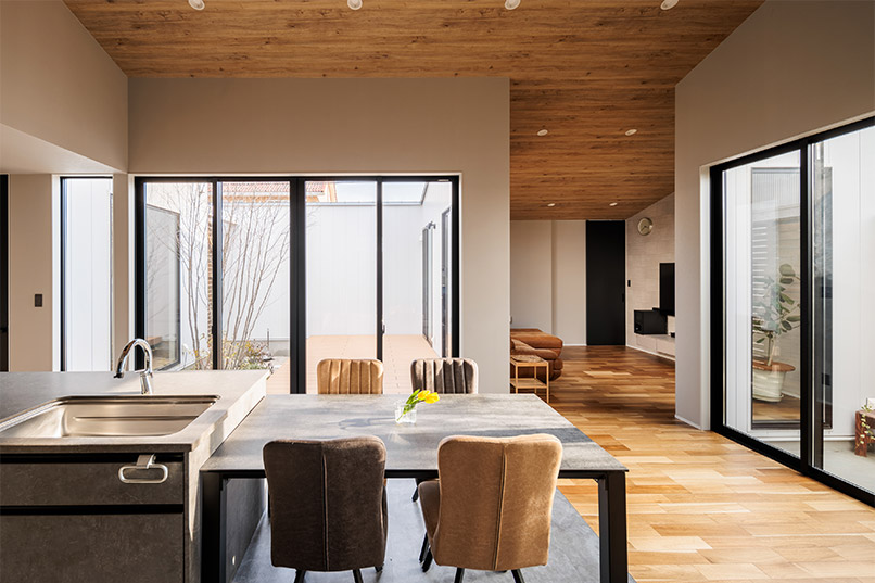 床と天井にはナラの無垢材を採用し、シックな佇まいの外観からは想像できない温かみのある室内となりました。家のどこにいても家族が繋がる、かけがえのない我が家です。