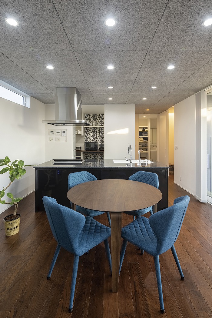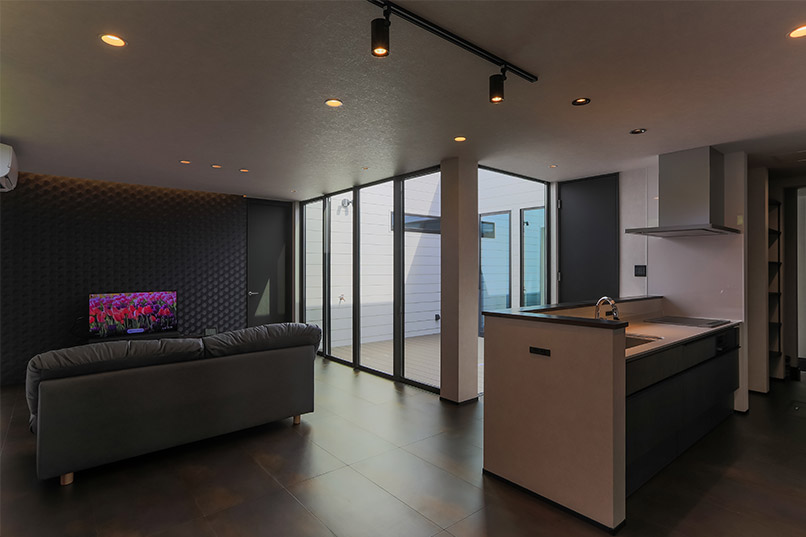 また、外部からの視線を遮るべく、中庭部分の壁の高さを調整し、カーテンの要らない生活を実現しました。外観の無機質な印象とは対照的に、キッチン部分にはコンクリート素材と木をふんだんに使い、シャープながら温かみのある空間とすることで、帰りたくなる我が家を実現しました。