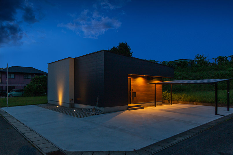 外壁は黒いガルバリウムをベースとし、無垢材のレッドシダーをアクセントに採用することで、どこか温もりを感じる外観に。夜間に光がもれる格子窓も建物にかわいらしい印象を与えてくれます。