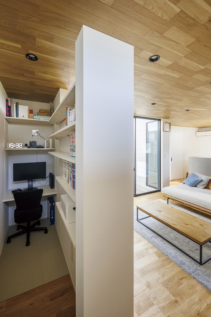 子供部屋のみを1階の部屋よりも高く配置し、その下を趣味のアウトドアスペースに。ロードバイクなどを収納できる土間としました。子供部屋からリビングを吹抜けにして開放感を演出すると同時に、階段を隠すことで2階建てであることを忘れるような空間に。